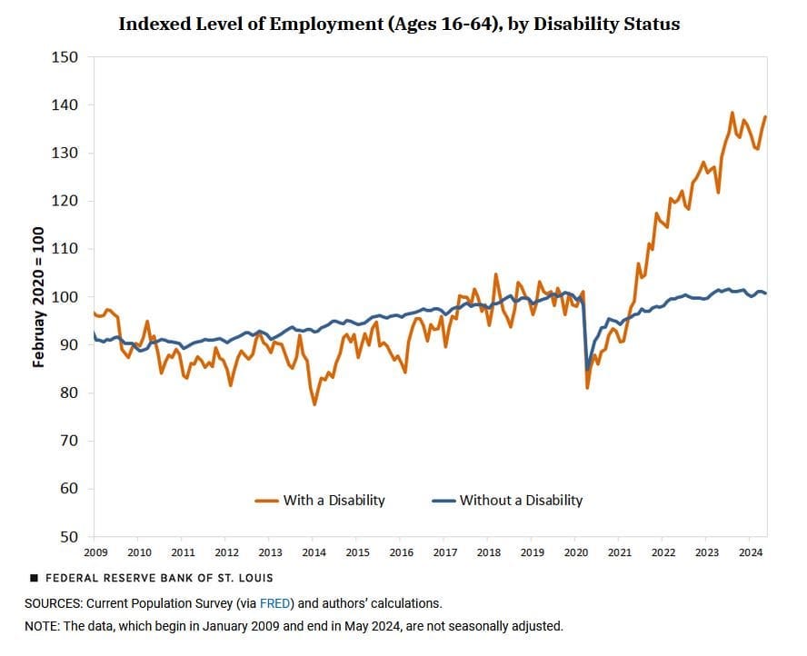 The Federal Reserve has noted a drastic increase in worker disability over the last four years. They try to explain it away, but ultimately they're forced to admit a 10 percent increase in disability in the working-age population.
