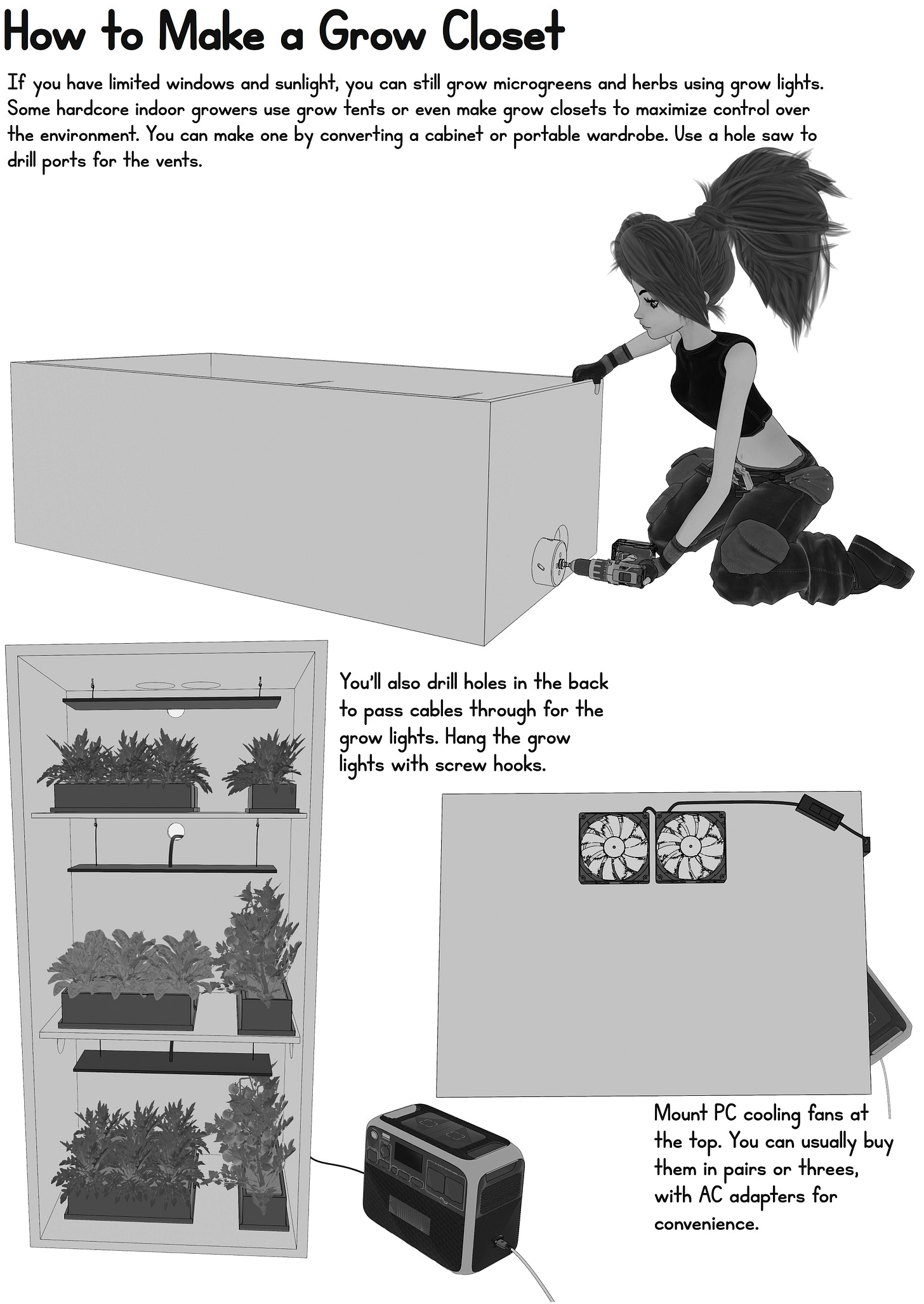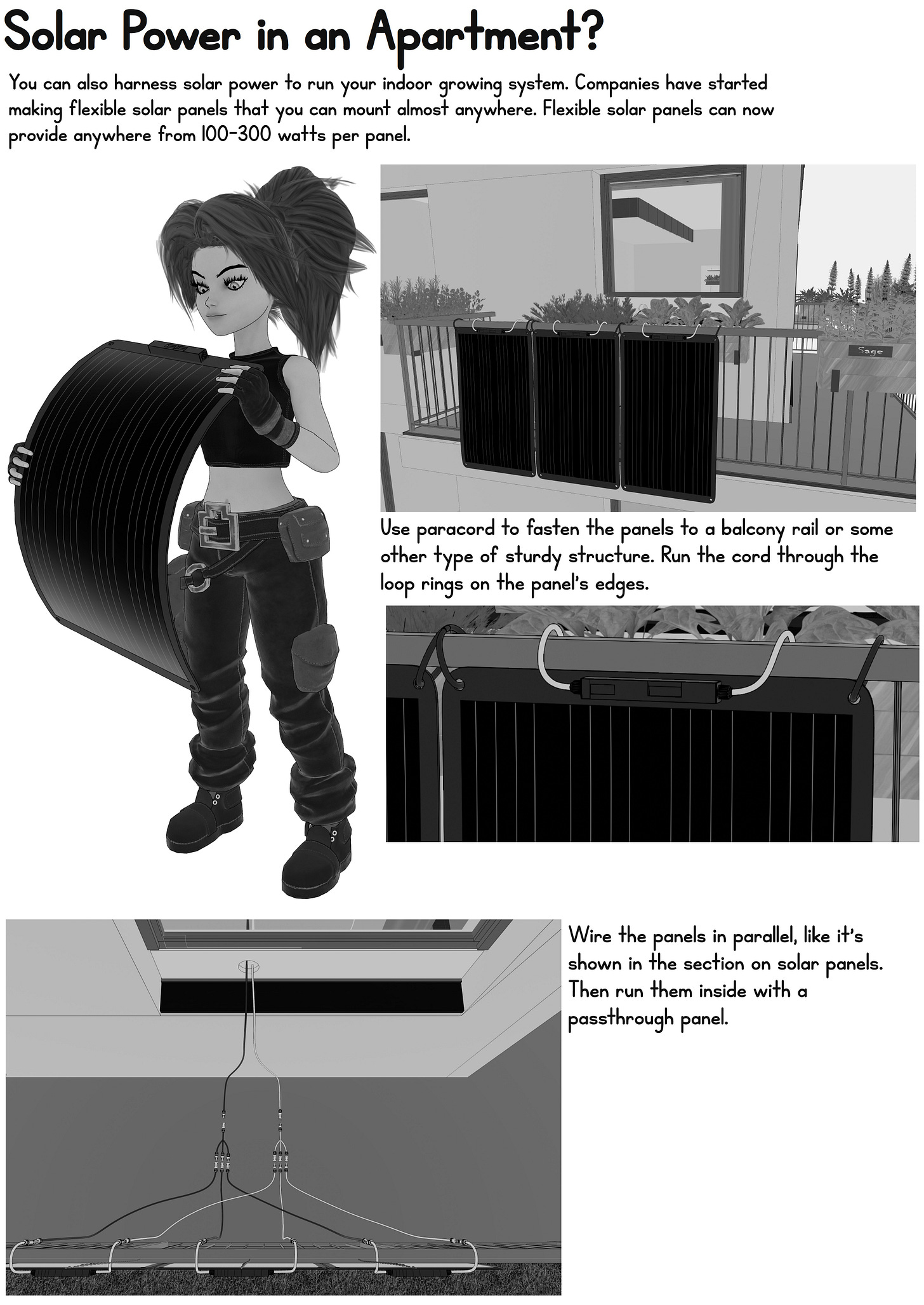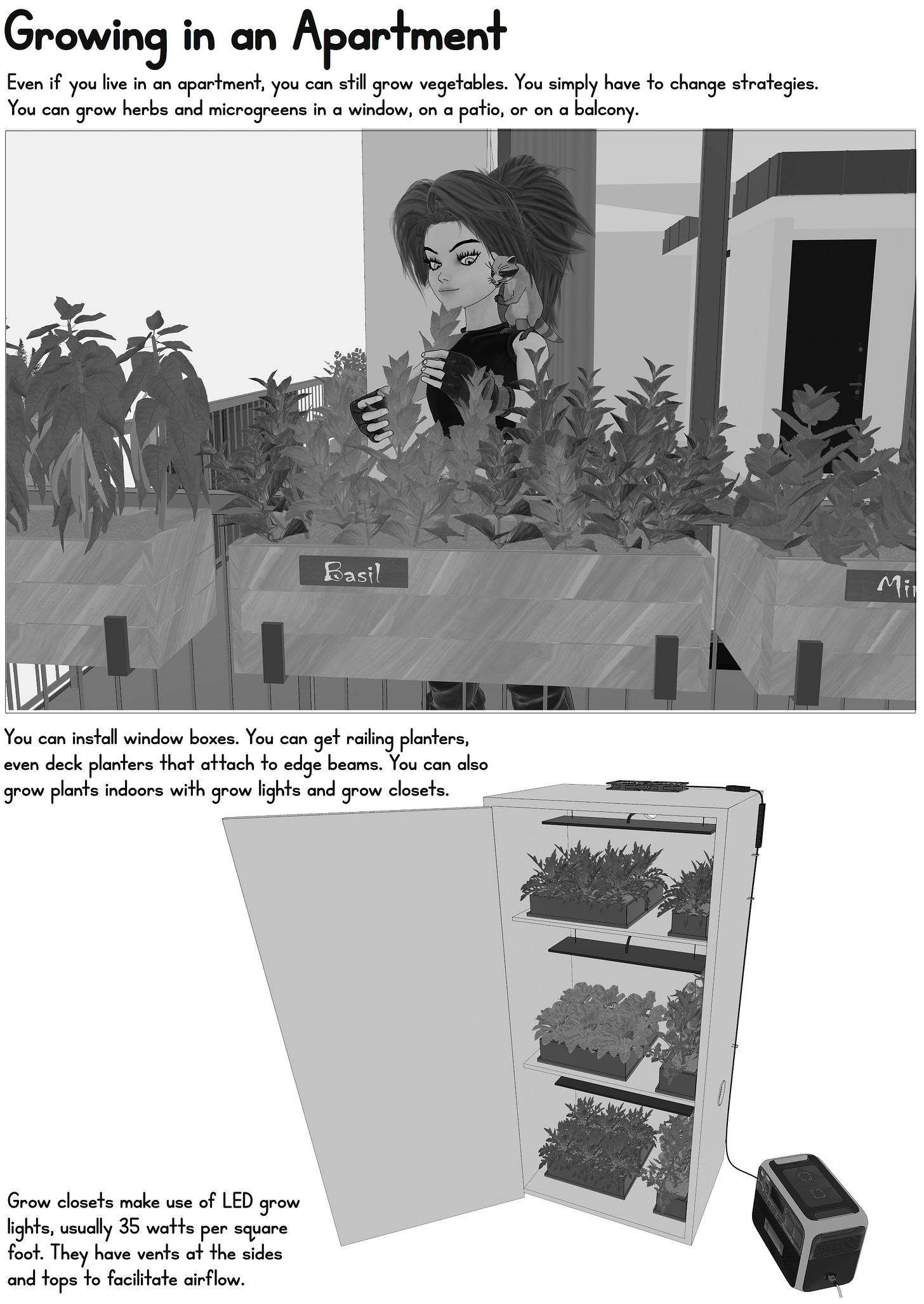 It might sound silly to try and grow microgreens or herbs in a small living space, but it’s not. Even the simplest herbs come packed with nutrients, and they can add a lot to pantry staples. I’ve also been looking into flexible solar panels and grow closets, to help in more urban environments. I’ll be adding some more detailed information about herb harvesting, etc, in the final version.