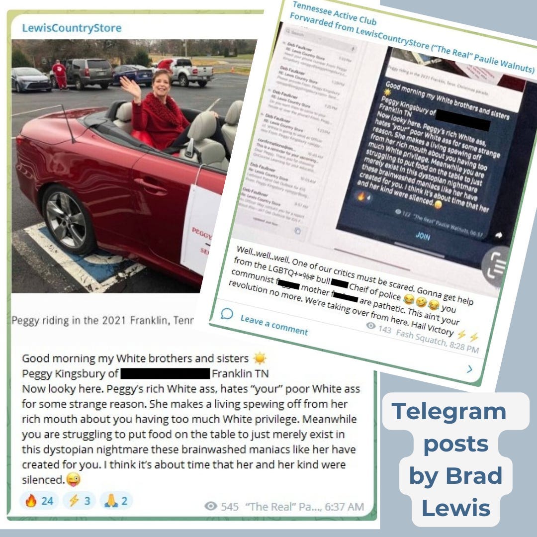 One neo-Nazi named Brad Lewis, brother to Nashville’s notorious attorney Bryan Lewis, has threatened Gabrielle Hanson’s critics on social media, particularly Peggy Kingsbury, a former cop and police detective.