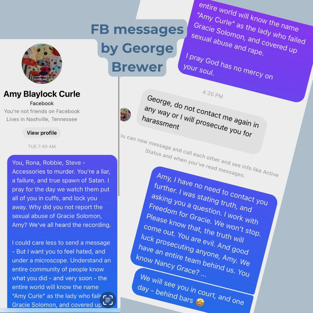About a week before Brad Lewis made threatening posts to silence Peggy, Fairview police arrested George Brewer for harassment. Williamson County police booked him. Like Peggy, George is another Grant and Gracie supporter whom Angie Solomon holds in high regard.